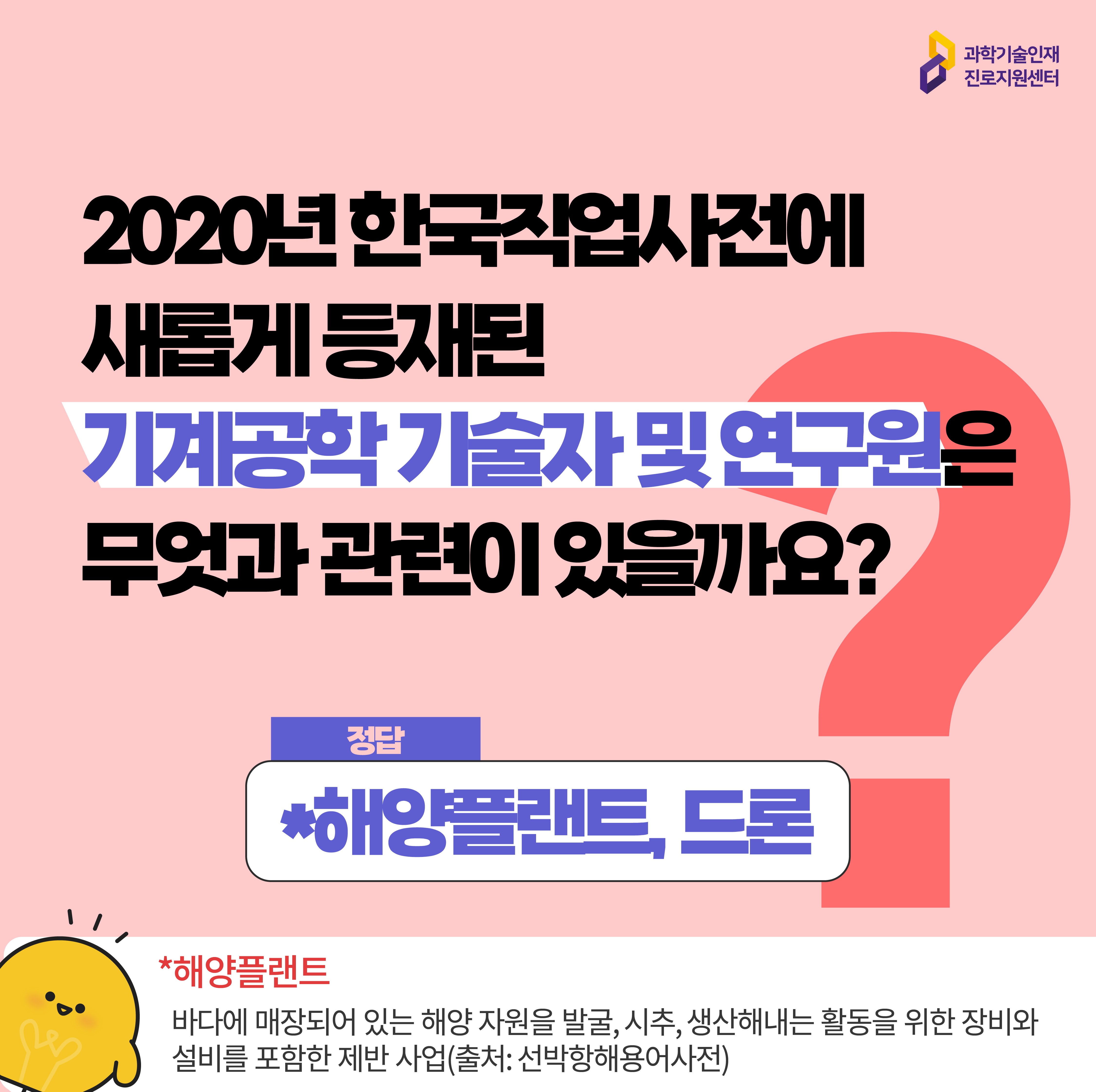한국직업사전 신규 등재 직업(2020) 공학 전문직 - 기계공학과 로봇 기계공학과 로봇 기계공학 기술자및연구원/로봇공학기술자및연구원 과학기술정보통신망 한국과학창의재단 과학기술인재진로지원센터